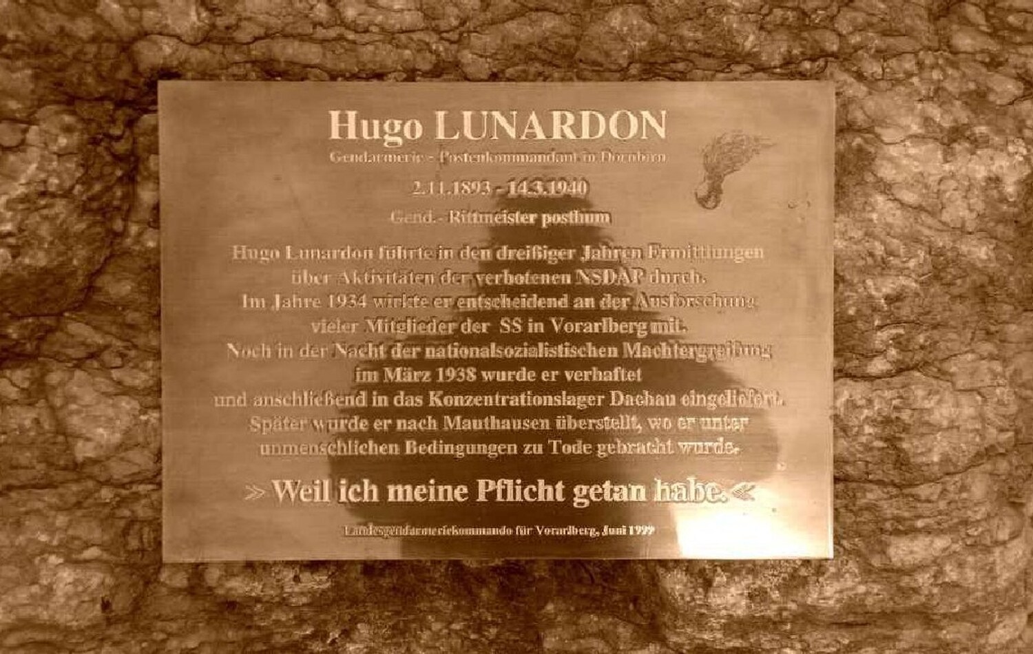 Hugo Lunardon, der Gendarm aus Vorarlberg, starb an Erschöpfung. Im Sterben soll er gesagt haben: „Alfons, Du kommst vielleicht noch heim, grüß mir Frau und Kinder.“ Politik war nicht seine Sache gewesen. Aber sein Verhängnis.