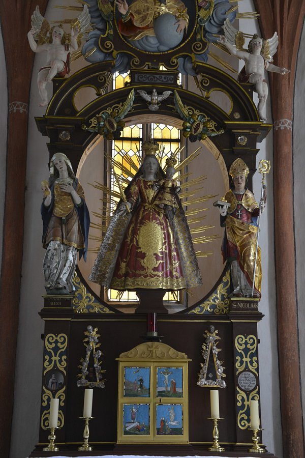 1392 gotische Kapelle urkundlich erwähnt, Neubau von 1484 durch Rolle Maiger, zwischen 1693 und 1733 barockisiert