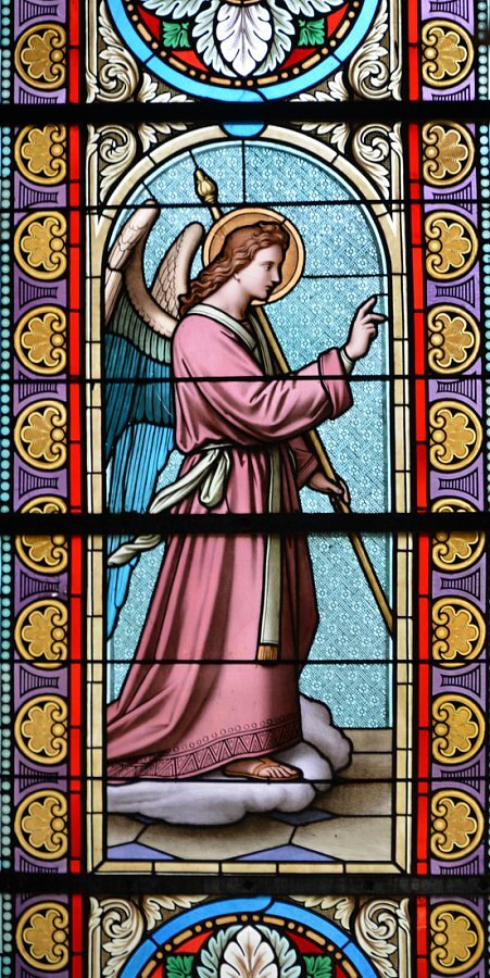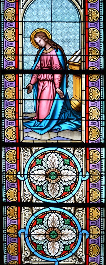 Verkündigung an Maria, 2 Fenster Engel und Maria, 1873 früheste Fenster der Tiroler Glasmalerei in Vorarlberg