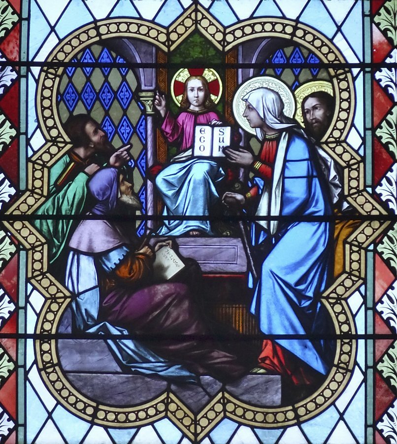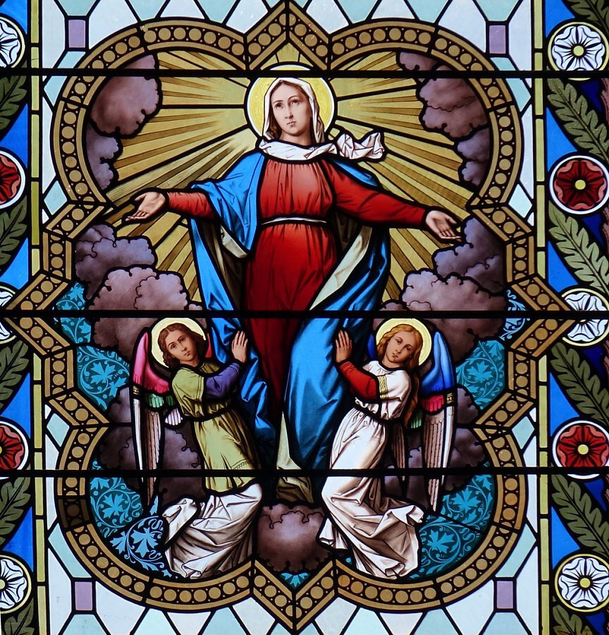 Langhaus um 1950: von W n. O, re. Marienkrönung, Himmelfahrt Mariä, Pfingstwunder, Auferstehung ; li. Verkündigung, Goldene Pforte, Geburt Christi, der 12-jährige Jesus im Tempel, Darstellung im Tempel