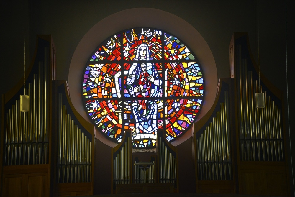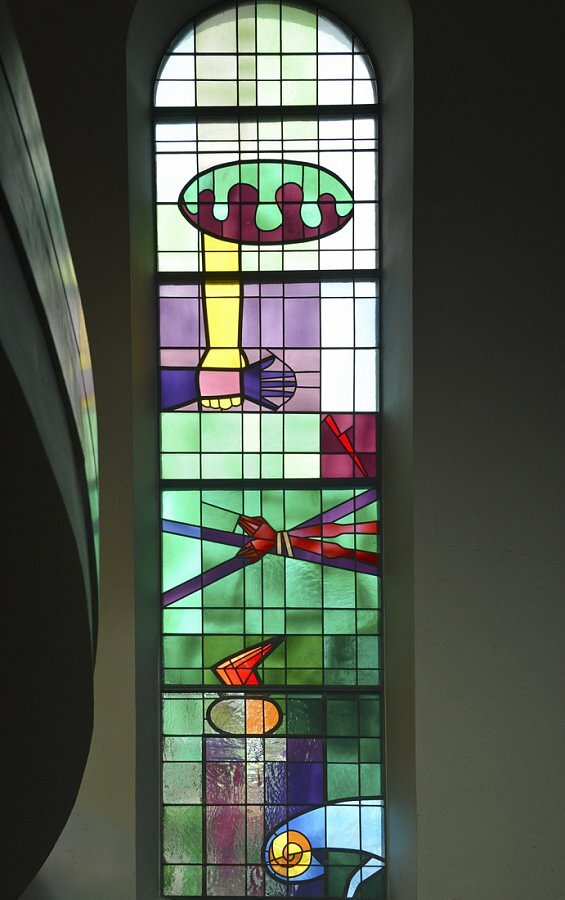 im Langhaus Fenster von Erich Huber, 1963/64: Erschaffung des Kosmos, Anbetung der Könige, Opfer Abrahams, Samariterin am Jakobsbrunnen, Arche Noahs, Erweckung des Lazarus, Symbol der Taufe und Eucharistie