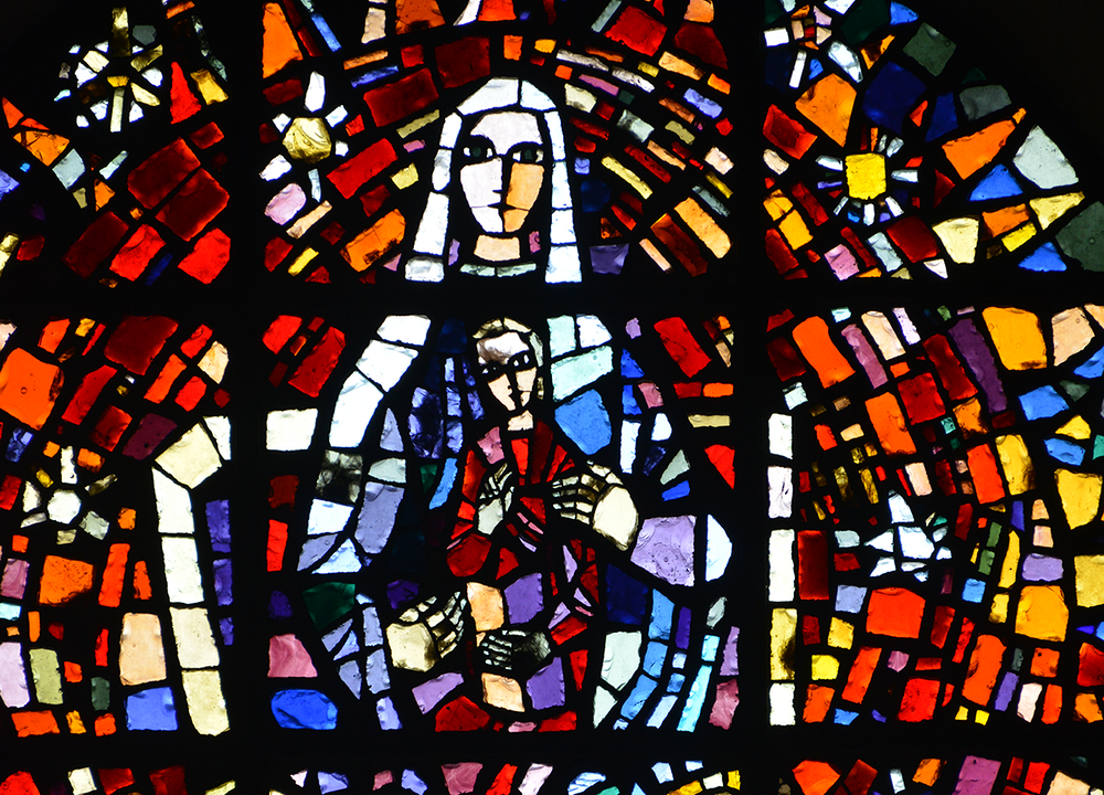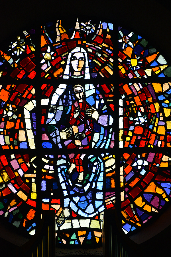 Glasgemälde von Martin Häusle, 1964: Rosette: Thronende Maria mit Kind; Toreinrahmung: Brennender Dornenbusch;