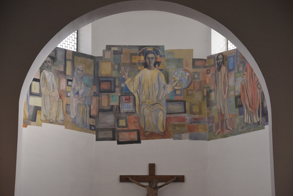 Fresko an der Chorwand bez. Martin Häusle 1964: Jesus umgeben von Hll. Paulus, Petrus, Maria, Johannes d.T., Zeno, Pankratius, Dominikus und Katharina.