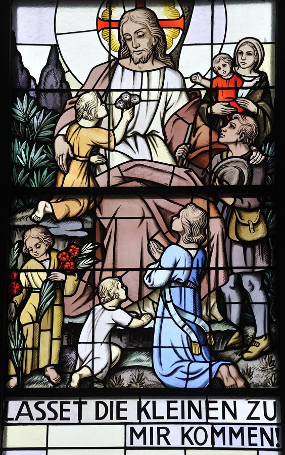 Lauterach, Pfarrkirche Hl. Georg, Christus mit Kindern, LASSET DIE KLEINEN ZU MIR KOMMEN