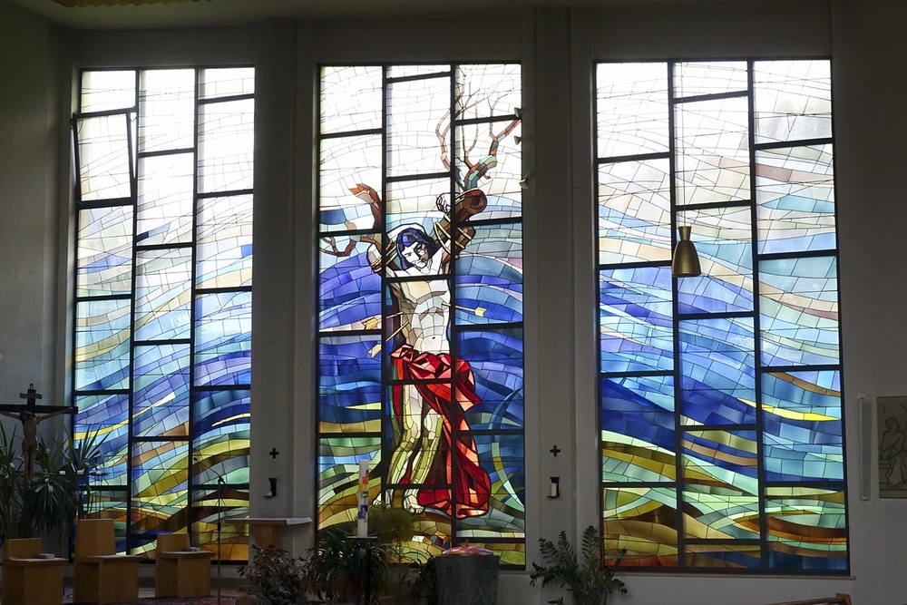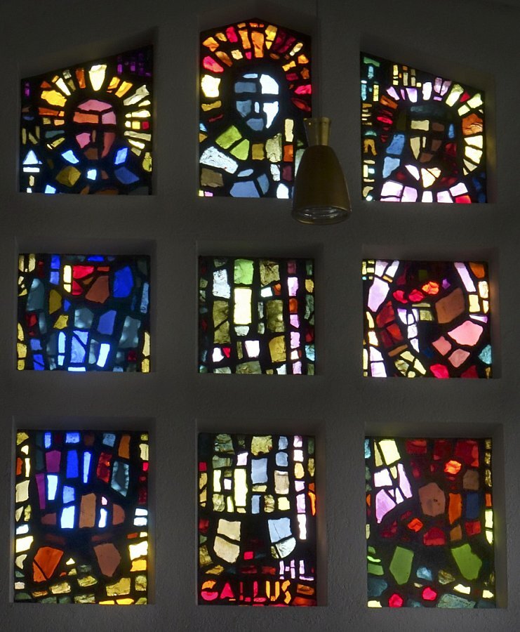 Betonglasfenser an der Fassade von Konrad Honold, 1960, li. hl. Ignatius, Mitte hl. Gallus, re. hl. Theresia von Lisieux